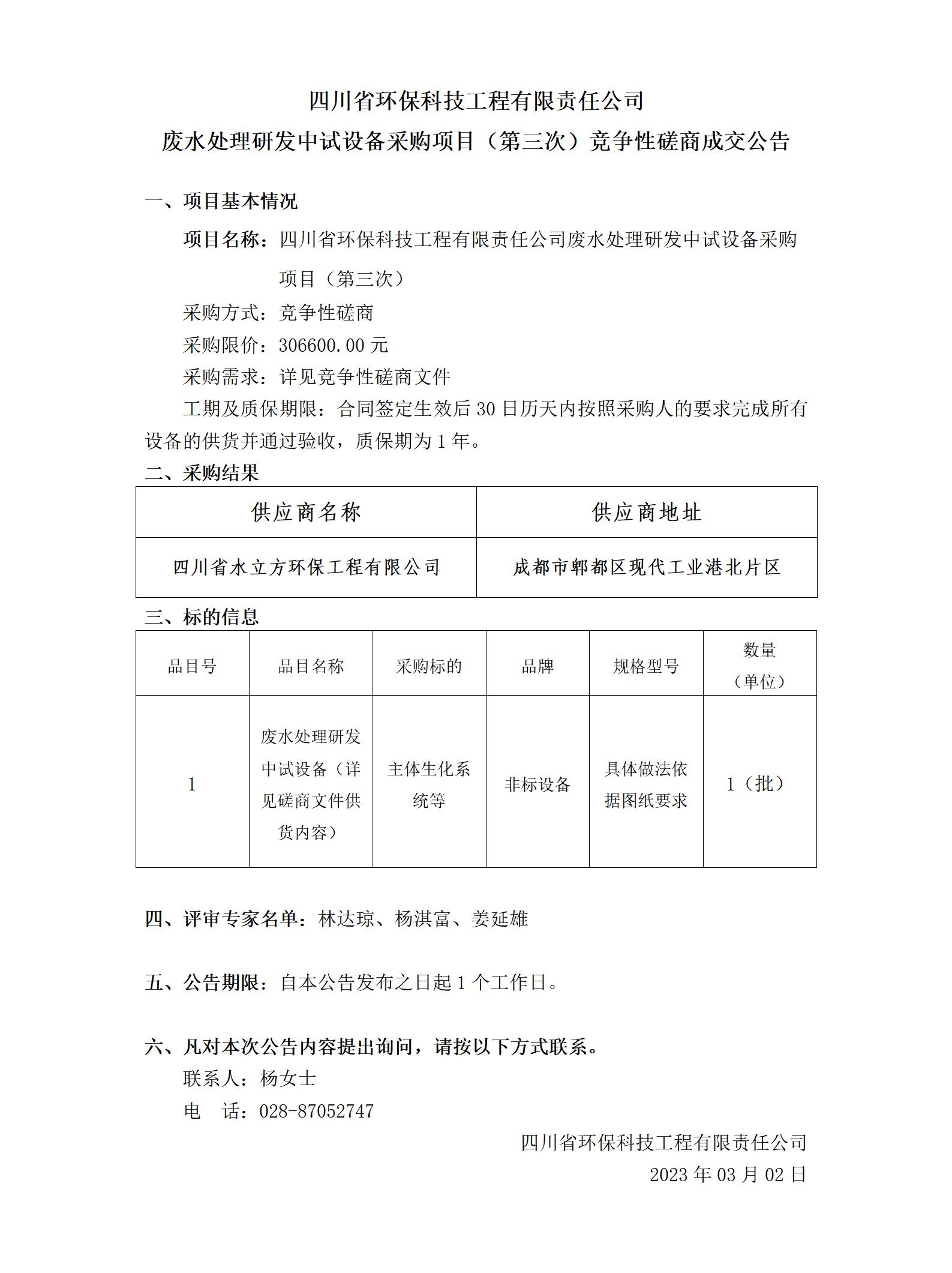 廢水處理研發(fā)中試設(shè)備采購項(xiàng)(第三次)競爭性磋商成交公告