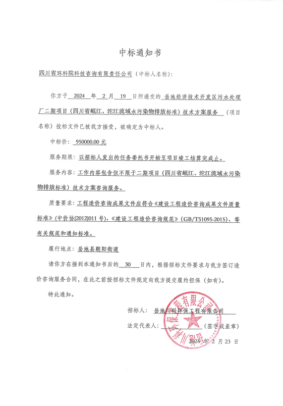 岳池經濟技術開發(fā)區(qū)污水處理廠二期項目(四川省岷江、沱江流域水污染物排放標準)技術方案服務—中標通知書